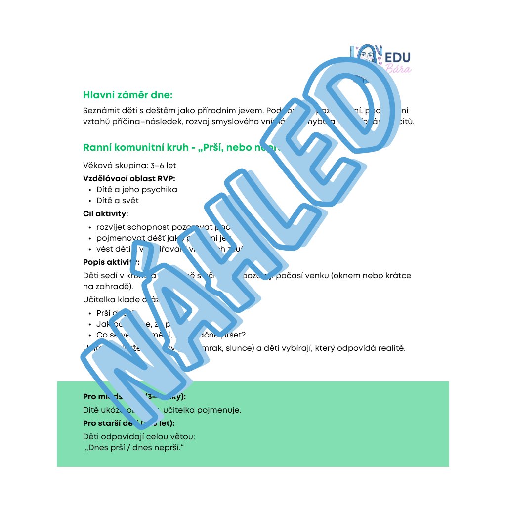 Kompletní celodenní vzdělávací program zaměřený na téma deště, který dětem hravou a smyslovou formou přibližuje tento základní přírodní jev