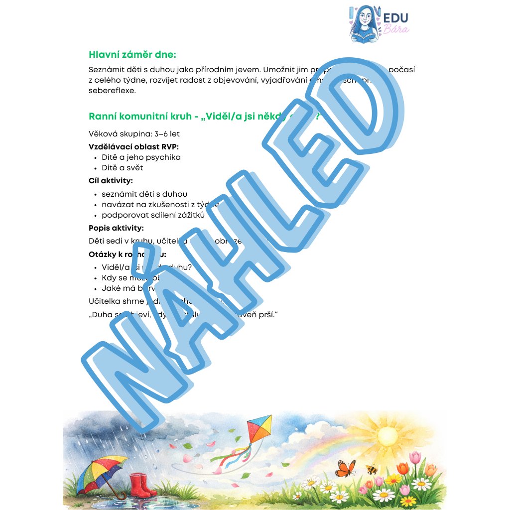 Ranní komunitní kruh „Viděl/a jsi někdy duhu?“: Sdílení osobních zážitků a vysvětlení jednoduché věty: „Duha vzniká, když svítí slunce a zároveň prší“