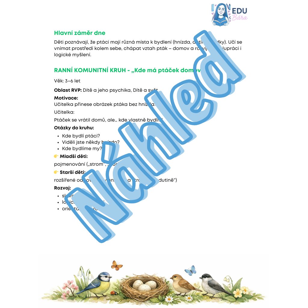 Kompletní celodenní vzdělávací program, který dětem hravou formou přibližuje rozmanitost ptačích obydlí a význam bezpečného domova