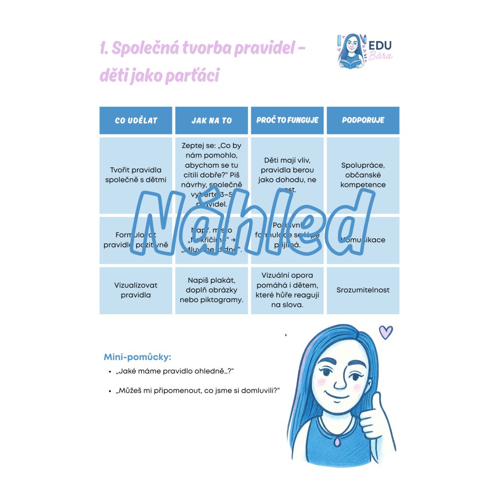 Najdeš v něm konkrétní věty, tipy a postupy, jak zvládat každodenní situace s dětmi s klidem a bez křiku. Každá kapitola je přehledná, krátká a doplněná mini-checklistem, aby ses k ní mohla kdykoliv vrátit.