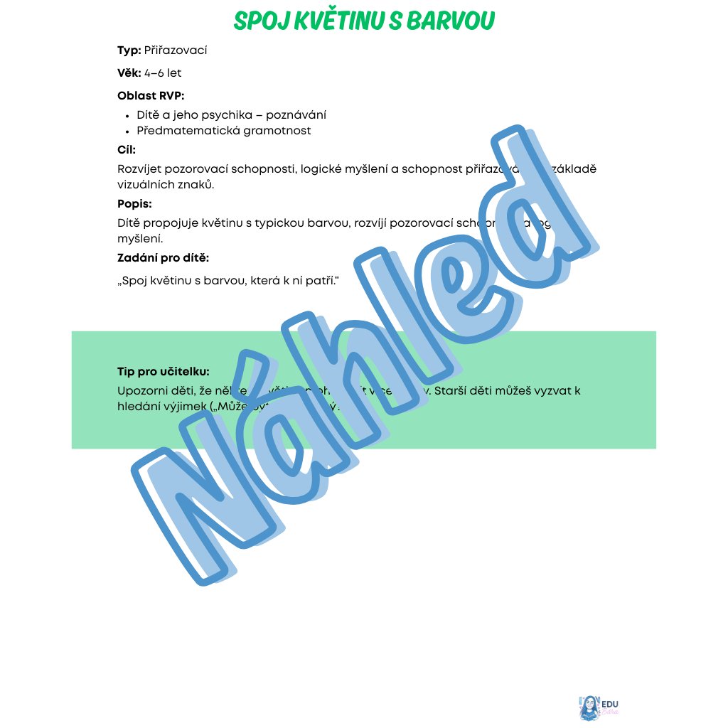 📒 Pracovní listy a úkoly: Poznávací listy „Poznej jarní květiny“, vybarvovací aktivity a logické spojování květin s barvami