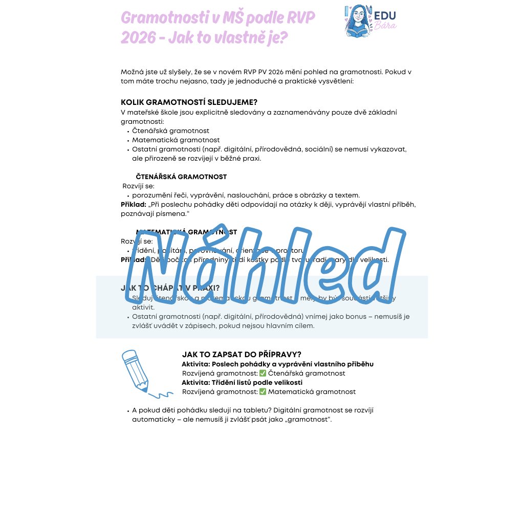 Pro učitelky mateřských škol, ředitelky, koordinátorky ŠVP i celé pedagogické týmy. Pomůže vám rychle se zorientovat v RVP PV 2026 a proměnit ho v nástroj, který šetří čas a přináší jistotu.