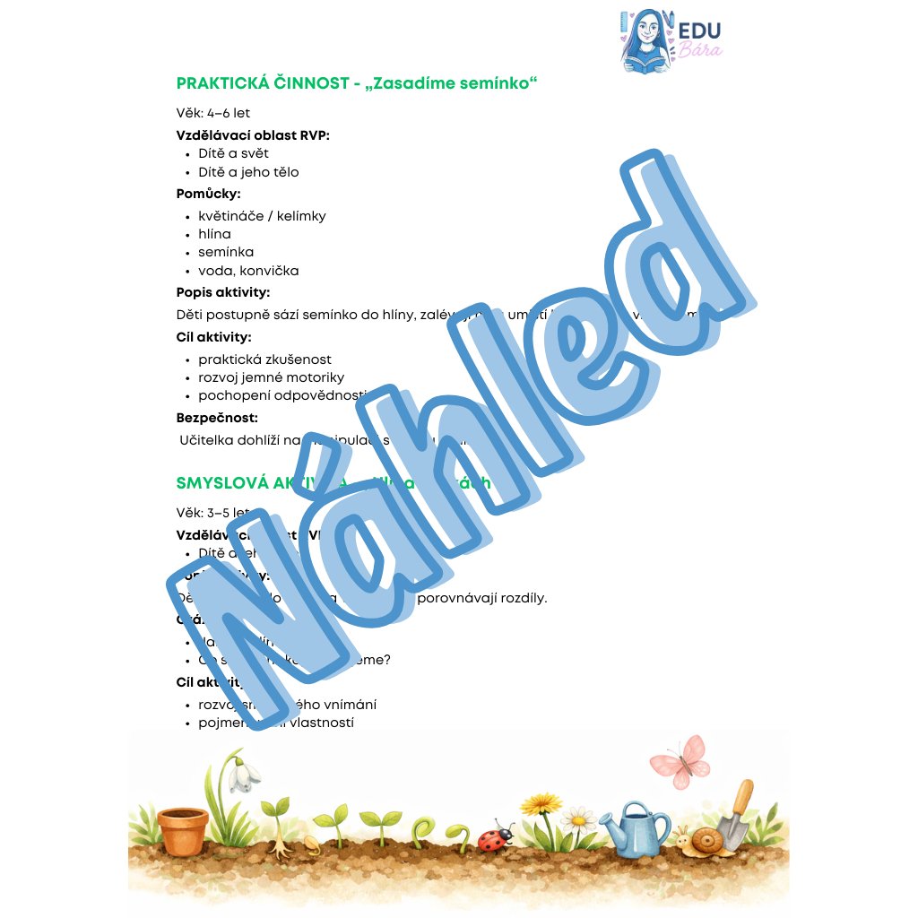 Praktická činnost „Zasadíme semínko“: Podrobný postup sázení (příprava hlíny, vkládání semínka, první zálivka) s důrazem na jemnou motoriku.