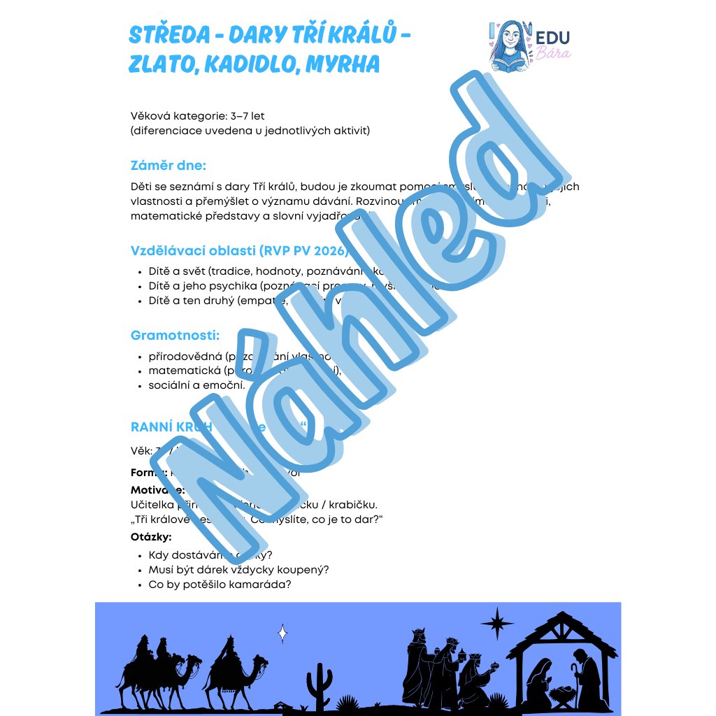 Tento e-book nabízí ucelený tematický týden (pondělí–pátek), kde se děti krok za krokem seznamují s příběhem Tří králů, hvězdou, cestou, dary i dnešní tradicí. Vše je postaveno prožitkově, hravě a s důrazem na emoce, spolupráci a porozumění, ne na výkon.