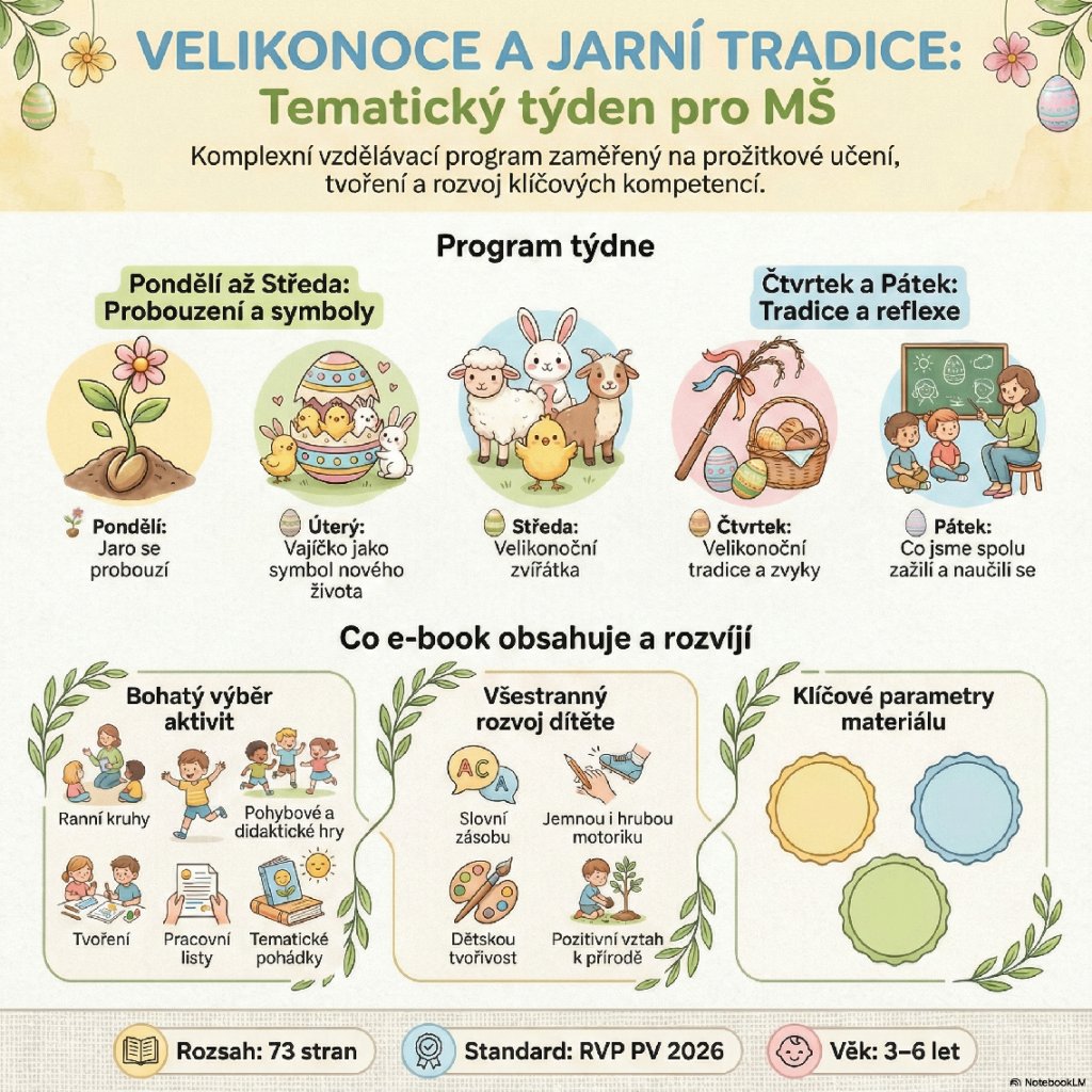 E-book Velikonoce a jarní tradice je ucelený týdenní tematický plán (pondělí–pátek), který propojuje jaro, velikonoční symboly, zvířátka, tradice, emoce i společné zážitky – přirozeně, hravě a s respektem k různému rodinnému zázemí dětí.